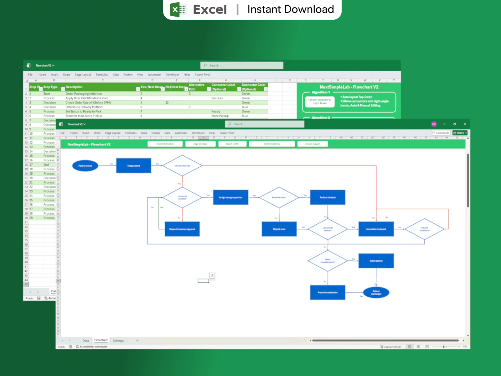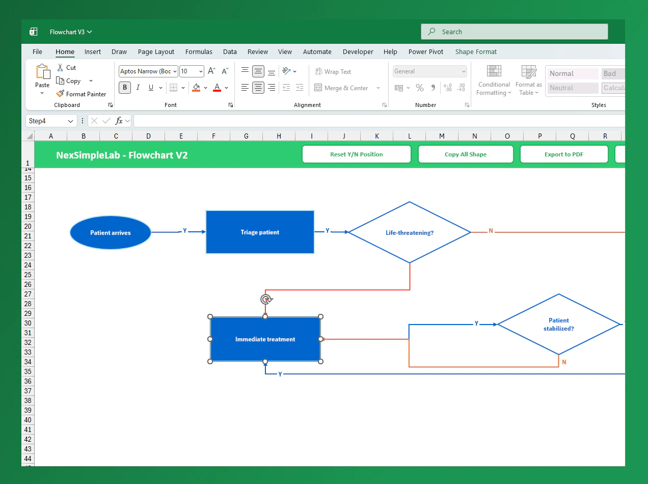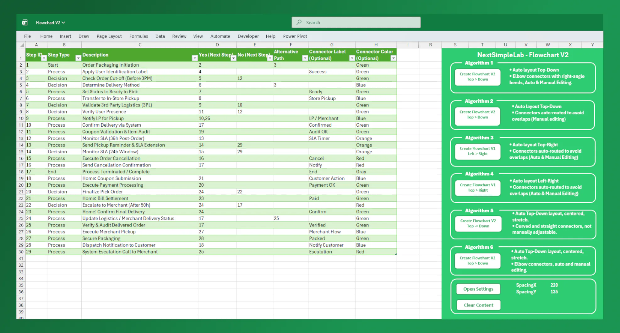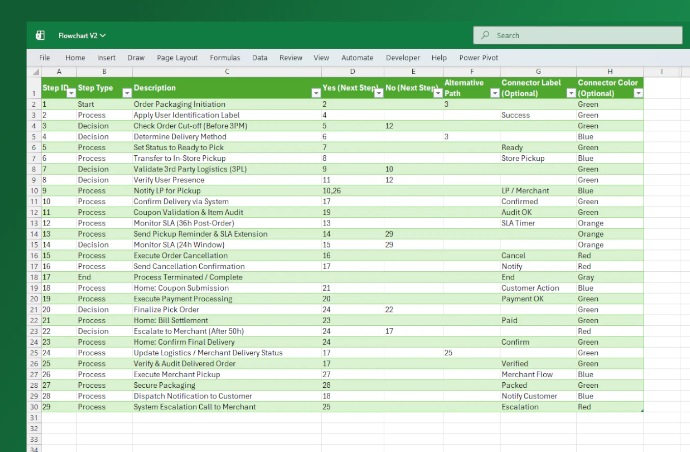 Automatically arranges shapes and connectors to minimize line intersections. Using only StepID and NextID, the VBA algorithm intelligently calculates positions for shapes, connectors, and labels—ensuring a clean and readable flowchart in seconds.