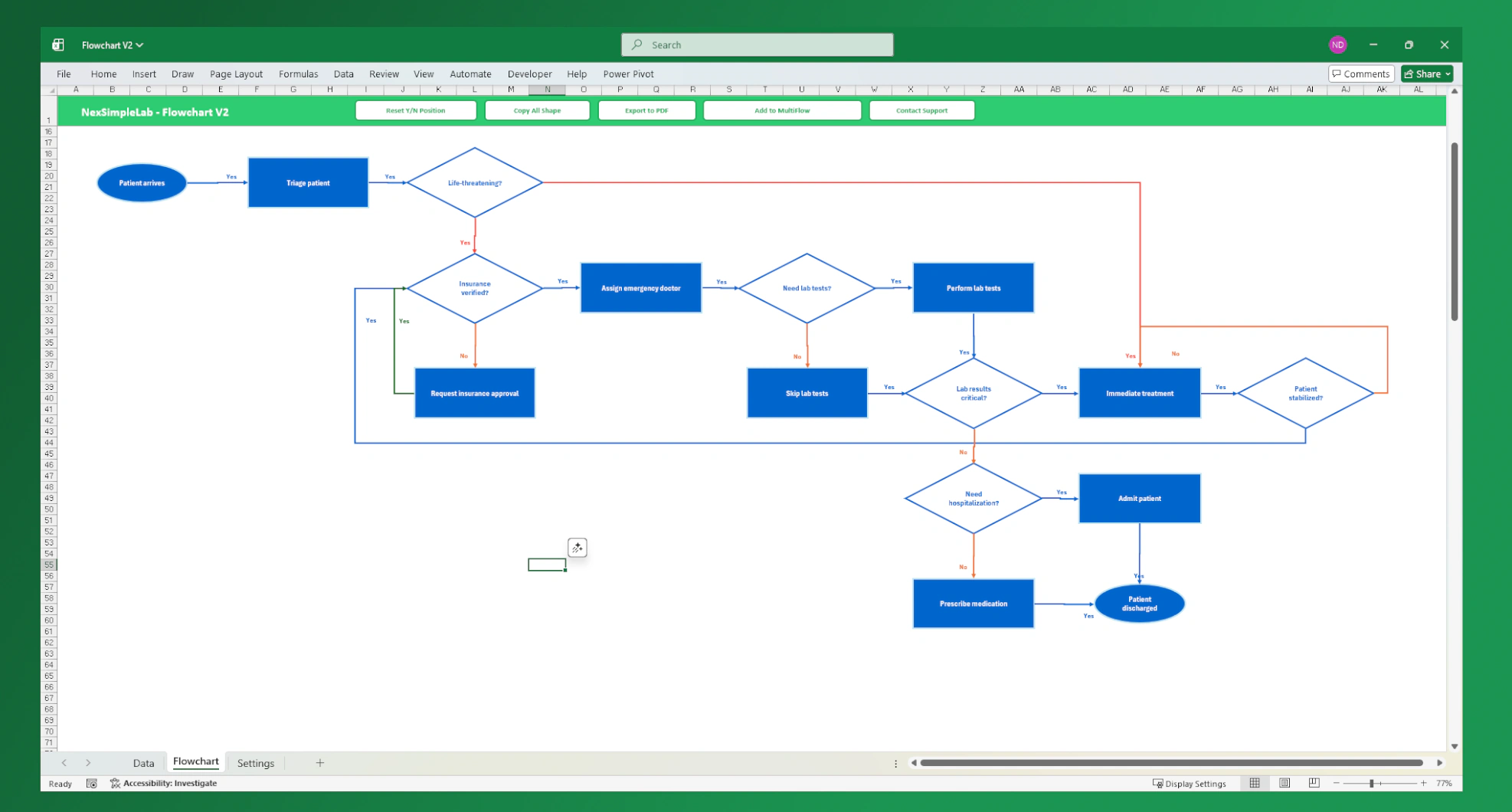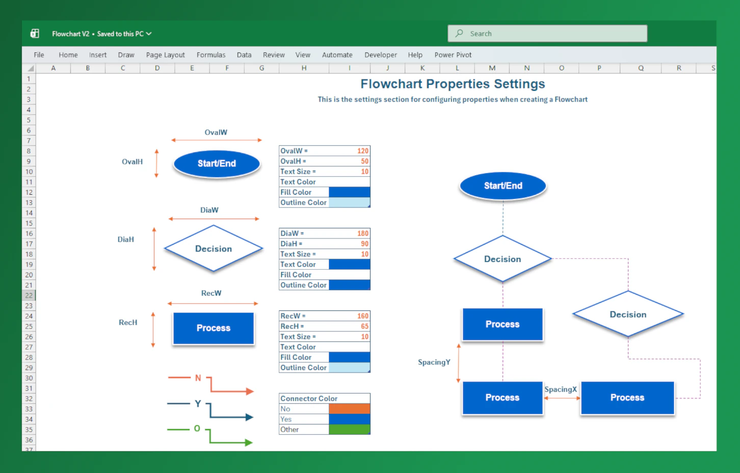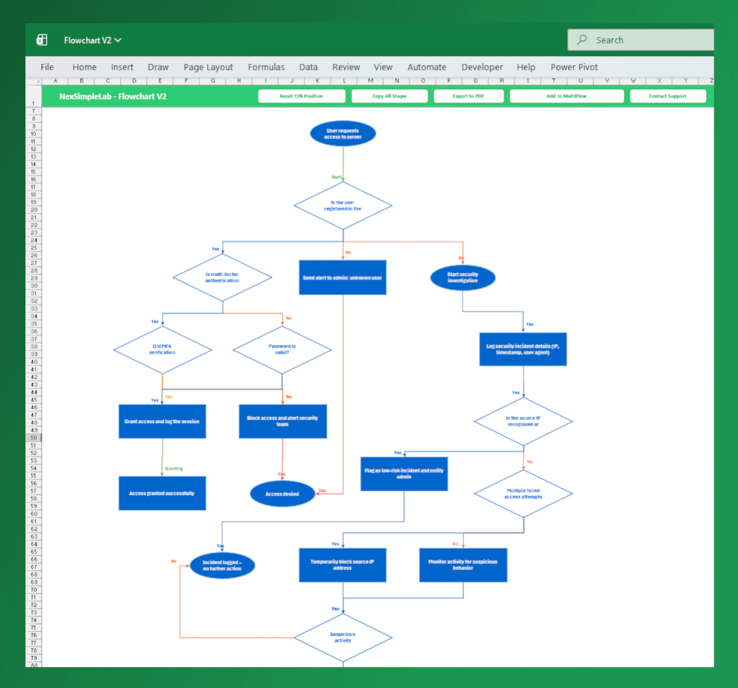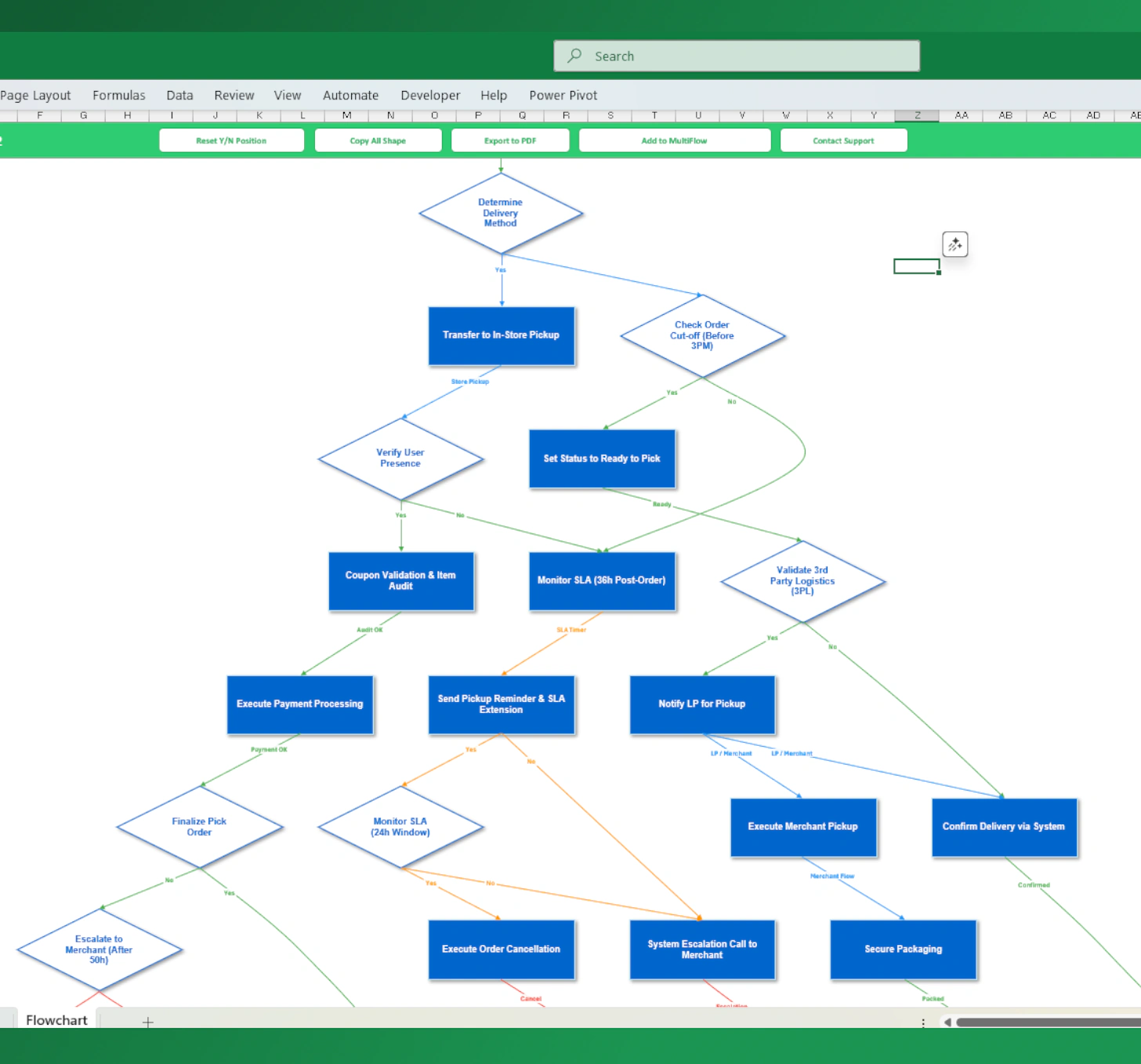 Automatically arranges shapes and connectors to minimize line intersections. Using only StepID and NextID, the VBA algorithm intelligently calculates positions for shapes, connectors, and labels—ensuring a clean and readable flowchart in seconds.