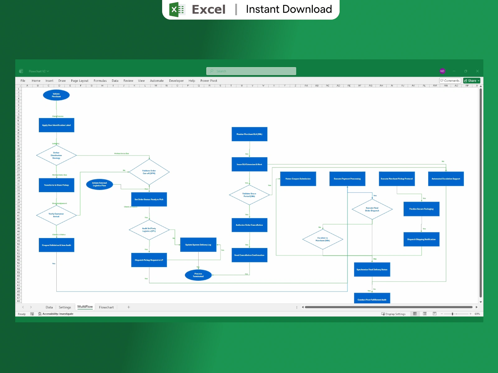 Engineered for industrial complexity. The MultiFlow engine manages massive processes across multiple sheets, linking sub-processes while maintaining unified visual styles.